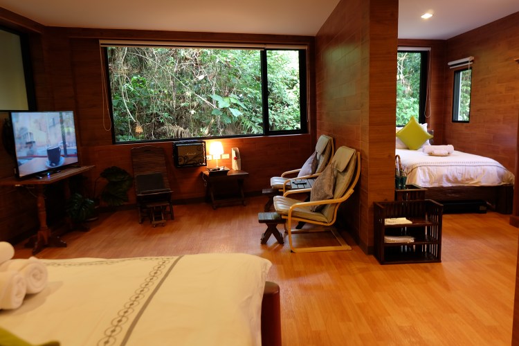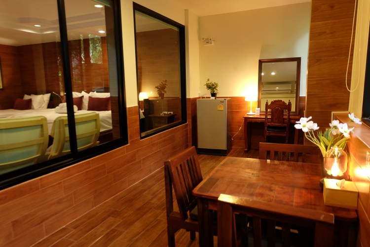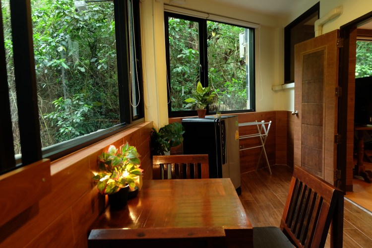 This homey room can welcome up to four guests. The dining area overlooks the stream of Namtok Sarika Waterfall.